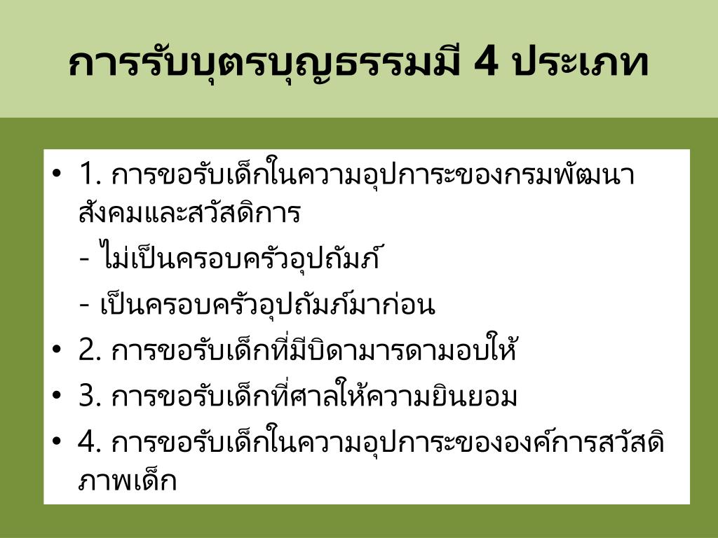 การรับบุตรบุญธรรมมี 4 ประเภท • 1. การขอรับเด็กในความอุปการะของกรมพัฒนาสังคมและสวัสดิการ - ไม่เป็นครอบครัวอุปถัมภ์ - เป็นครอบครัวอุปถัมภ์มาก่อน • 2. การขอรับเด็กที่มีบิดามารดามอบให้ • 3. การขอรับเด็กที่ศาลให้ความยินยอม • 4. การขอรับเด็กในความอุปการะขององค์การสวัสดิภาพเด็ก