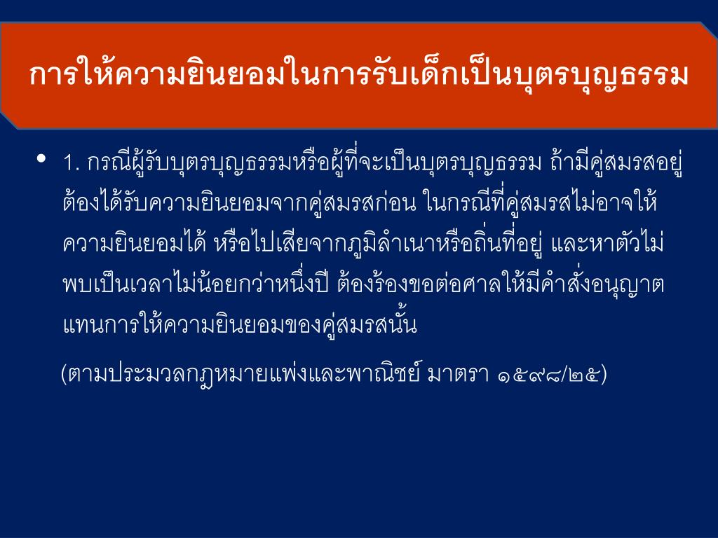 การให้ความยินยอมในการรับเด็กเป็นบุตรบุญธรรมการให้ความยินยอมในการรับเด็กเป็นบุตรบุญธรรม • 1. กรณีผู้รับบุตรบุญธรรมหรือผู้ที่จะเป็นบุตรบุญธรรม ถ้ามีคู่สมรสอยู่ต้องได้รับความยินยอมจากคู่สมรสก่อน ในกรณีที่คู่สมรสไม่อาจให้ความยินยอมได้ หรือไปเสียจากภูมิลำเนาหรือถิ่นที่อยู่ และหาตัวไม่พบเป็นเวลาไม่น้อยกว่าหนึ่งปี ต้องร้องขอต่อศาลให้มีคำสั่งอนุญาตแทนการให้ความยินยอมของคู่สมรสนั้น (ตามประมวลกฎหมายแพ่งและพาณิชย์ มาตรา ๑๕๙๘/๒๕)