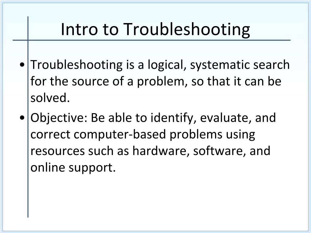 Intro to Troubleshooting • Troubleshooting is a logical, systematic search for the source of a problem, so that it can be solved. • Objective: Be able to identify, evaluate, and correct computer-based problems using resources such as hardware, software, and online support.