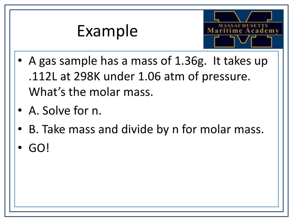 Example • A gas sample has a mass of 1.36g. It takes up .112L at 298K under 1.06 atm of pressure. What’s the molar mass. • A. Solve for n. • B. Take mass and divide by n for molar mass. • GO!