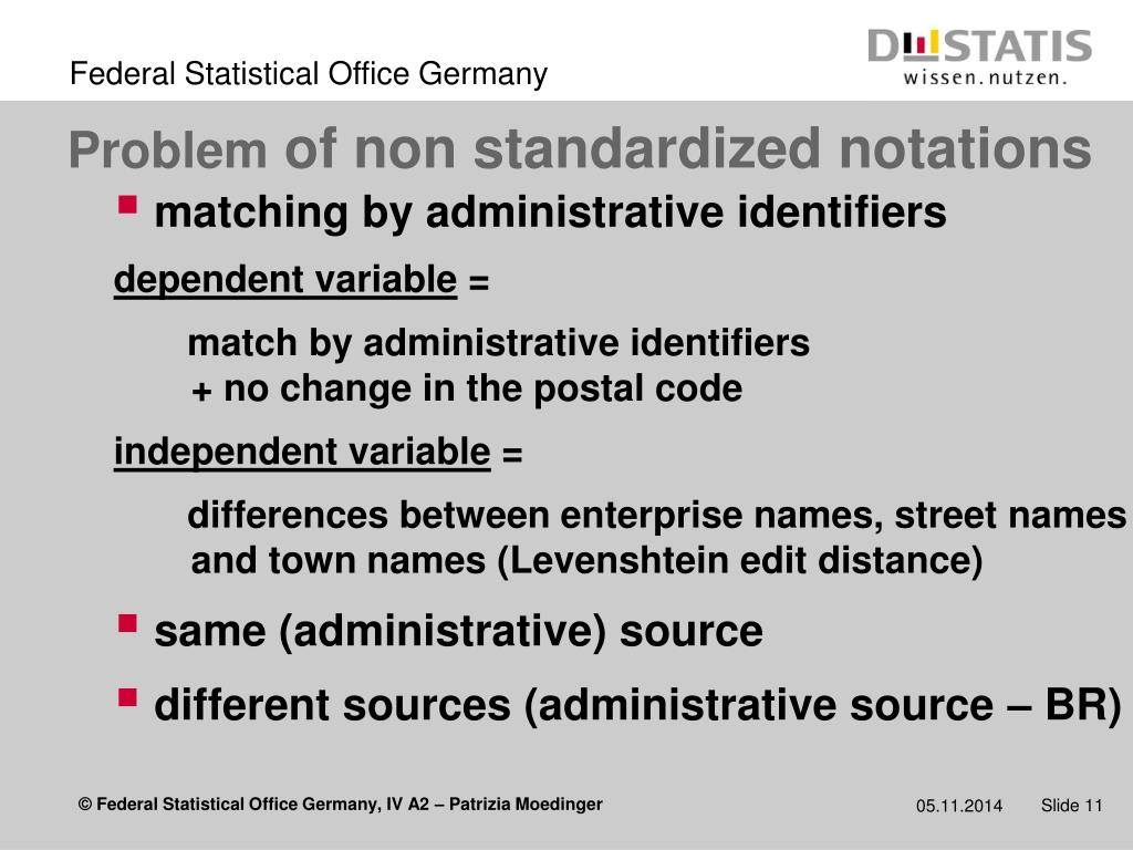 Problem of non standardized notations • matching by administrative identifiers • dependent variable = match by administrative identifiers + no change in the postal code • independent variable = differences between enterprise names, street names and town names (Levenshtein edit distance) • same (administrative) source • different sources (administrative source – BR)