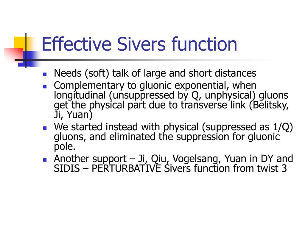 Effective Sivers function • Needs (soft) talk of large and short distances • Complementary to gluonic exponential, when longitudinal (unsuppressed by Q, unphysical) gluons get the physical part due to transverse link (Belitsky, Ji, Yuan) • We started instead with physical (suppressed as 1/Q) gluons, and eliminated the suppression for gluonic pole. • Another support – Ji, Qiu, Vogelsang, Yuan in DY and SIDIS – PERTURBATIVE Sivers function from twist 3