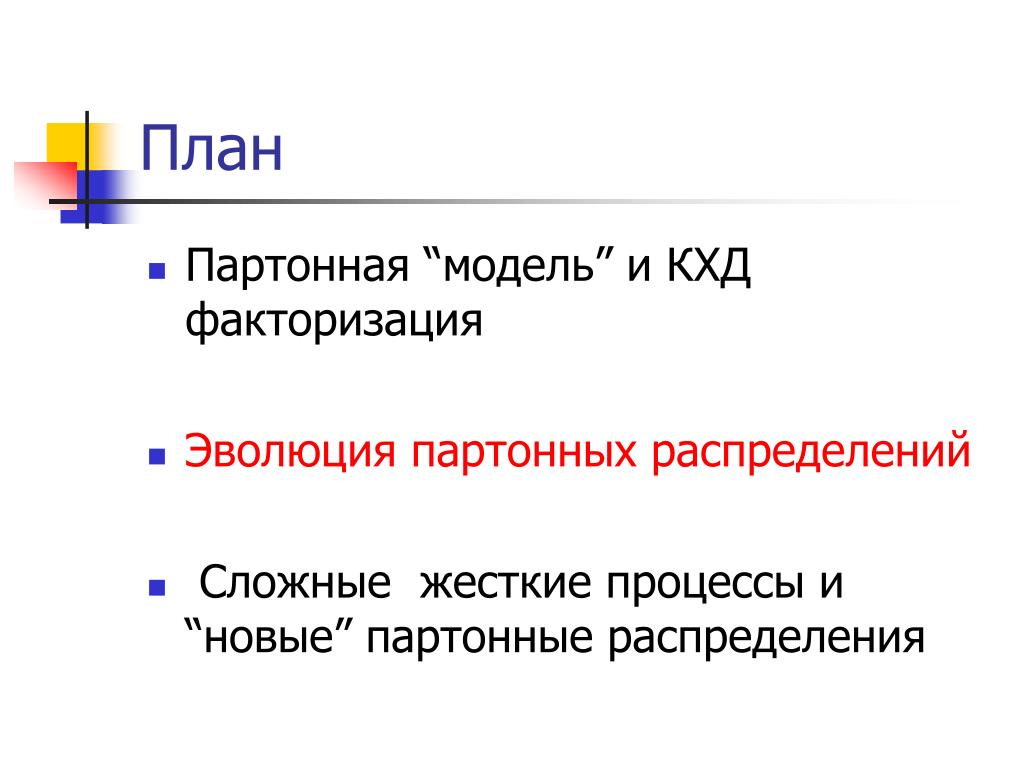 План • Партонная “модель” иКХД факторизация • Эволюция партонных распределений • Сложные жесткие процессы и “новые” партонные распределения