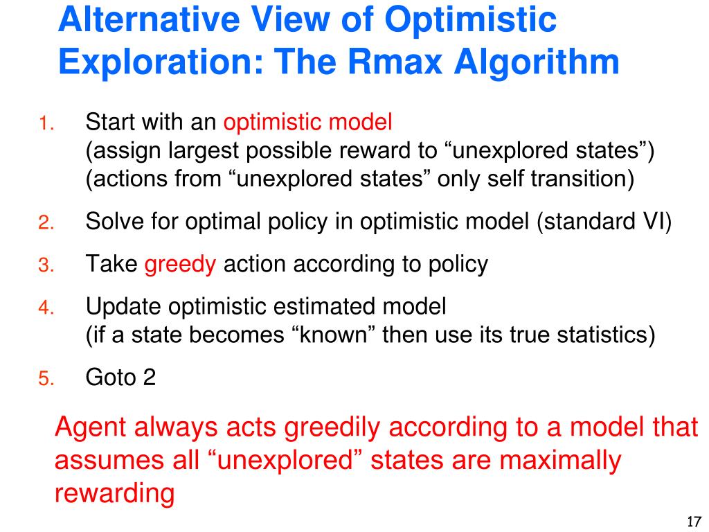 Alternative View of Optimistic Exploration: The Rmax Algorithm • Start with an optimistic model(assign largest possible reward to “unexplored states”)(actions from “unexplored states” only self transition) • Solve for optimal policy in optimistic model (standard VI) • Take greedy action according to policy • Update optimistic estimated model(if a state becomes “known” then use its true statistics) • Goto 2 Agent always acts greedily according to a model that assumes all “unexplored” states are maximally rewarding
