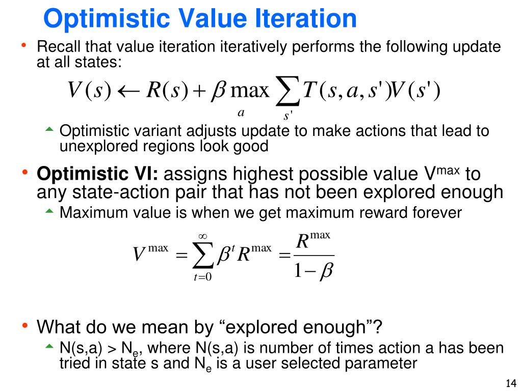 Optimistic Value Iteration Standard VI • Optimistic value iteration computes an optimistic value function V+ using following updates • The agent will behave initially as if there were wonderful rewards scattered all over around– optimistic . • But after actions are tried enough times we will perform standard “non-optimistic” value iteration