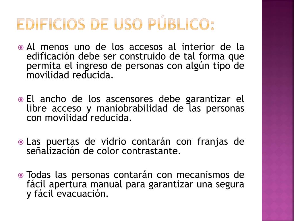 Edificios de Uso Público: • Al menos uno de los accesos al interior de la edificación debe ser construido de tal forma que permita el ingreso de personas con algún tipo de movilidad reducida. • El ancho de los ascensores debe garantizar el libre acceso y maniobrabilidad de las personas con movilidad reducida. • Las puertas de vidrio contarán con franjas de señalización de color contrastante. • Todas las personas contarán con mecanismos de fácil apertura manual para garantizar una segura y fácil evacuación.