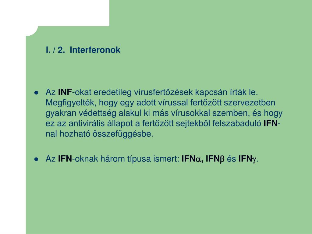 I. / 2. Interferonok • Az INF-okat eredetileg vírusfertőzések kapcsán írták le. Megfigyelték, hogy egy adott vírussal fertőzött szervezetben gyakran védettség alakul ki más vírusokkal szemben, és hogy ez az antivirális állapot a fertőzött sejtekből felszabaduló IFN-nal hozható összefüggésbe. • Az IFN-oknak három típusa ismert: IFN, IFNés IFN.