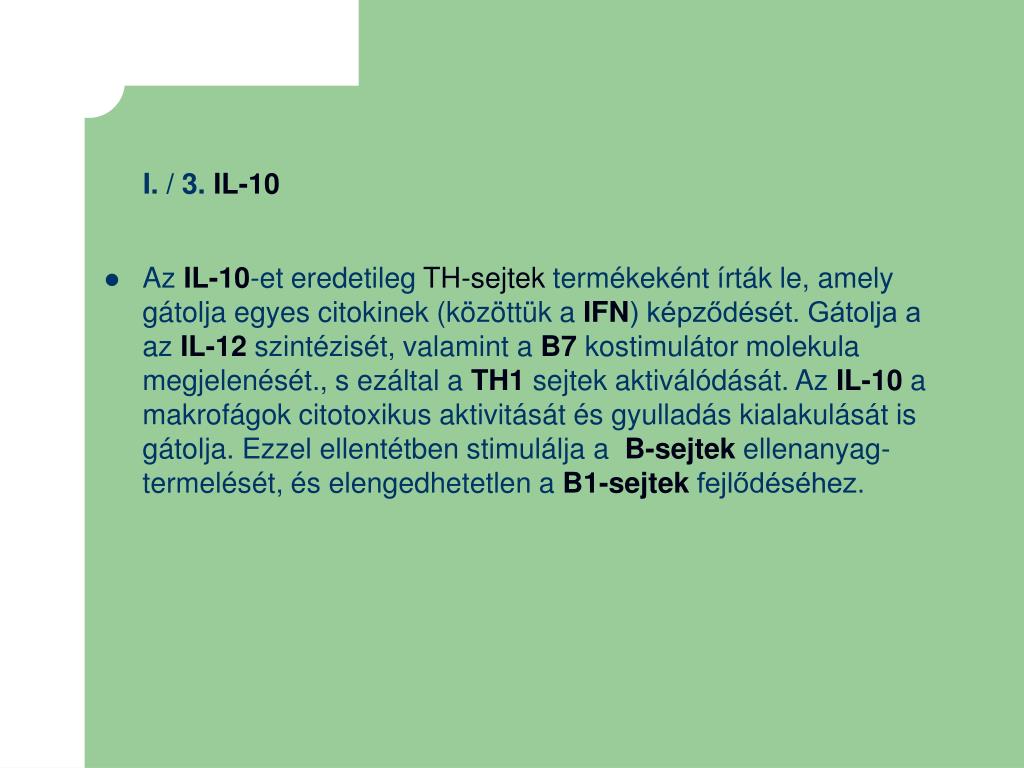 I. / 3. IL-10 • Az IL-10-et eredetileg TH-sejtek termékeként írták le, amely gátolja egyes citokinek (közöttük a IFN) képződését. Gátolja a az IL-12 szintézisét, valamint a B7 kostimulátor molekula megjelenését., s ezáltal a TH1 sejtek aktiválódását. Az IL-10 a makrofágok citotoxikus aktivitását és gyulladás kialakulását is gátolja. Ezzel ellentétben stimulálja a B-sejtek ellenanyag-termelését, és elengedhetetlen a B1-sejtek fejlődéséhez.