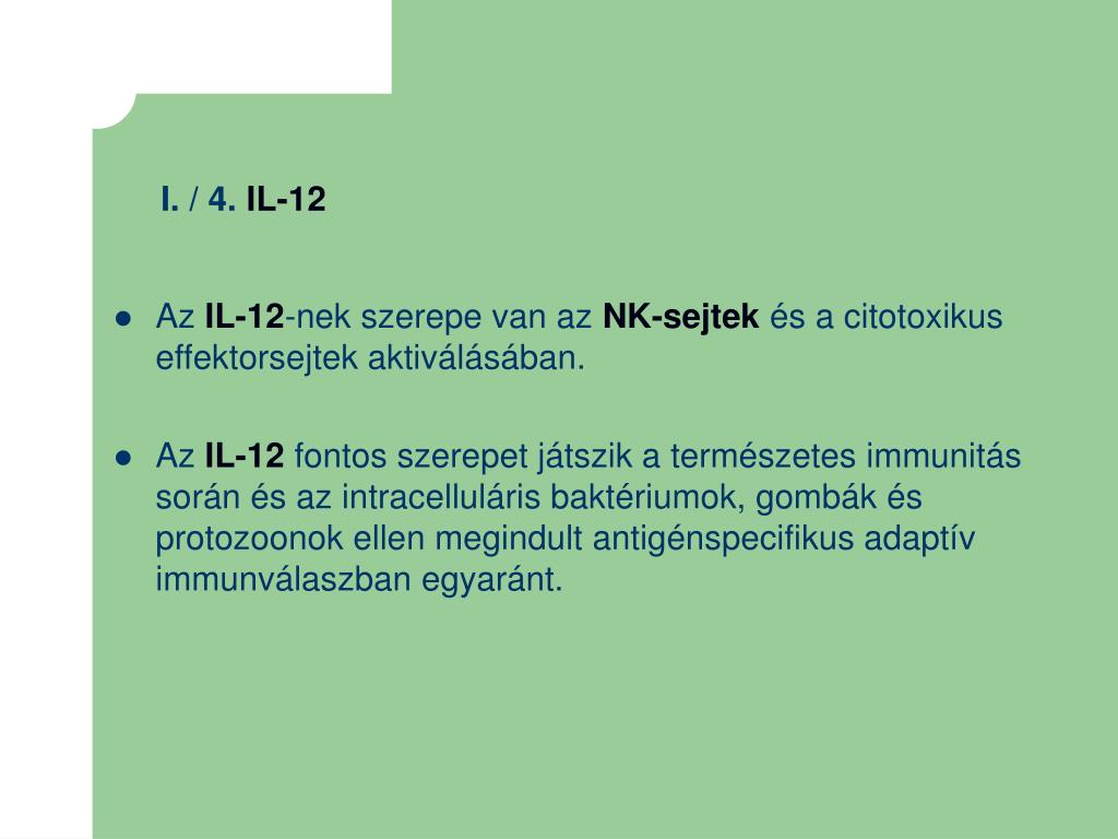 I. / 4. IL-12 • Az IL-12-nek szerepe van az NK-sejtek és a citotoxikus effektorsejtek aktiválásában. • Az IL-12 fontos szerepet játszik a természetes immunitás során és az intracelluláris baktériumok, gombák és protozoonok ellen megindult antigénspecifikus adaptív immunválaszban egyaránt.