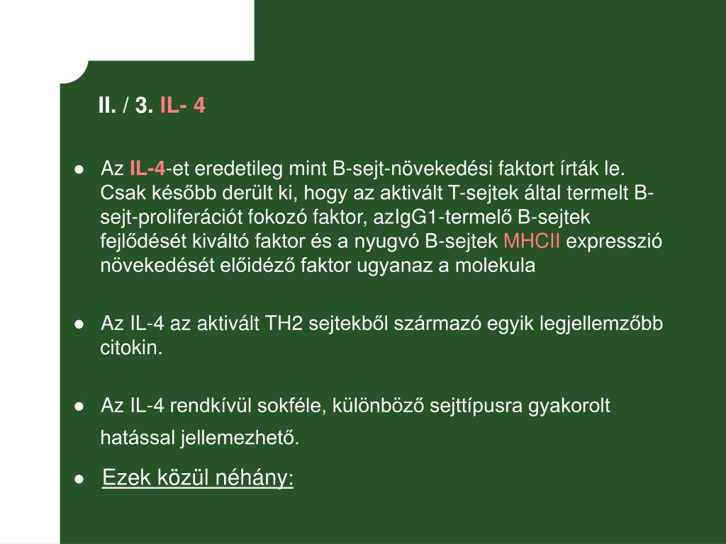 II. / 3. IL- 4 ● Az IL-4-et eredetileg mint B-sejt-növekedési faktort írták le. Csak később derült ki, hogy az aktivált T-sejtek által termelt B-sejt-proliferációt fokozó faktor, azIgG1-termelő B-sejtek fejlődését kiváltó faktor és a nyugvó B-sejtek MHCII expresszió növekedését előidéző faktor ugyanaz a molekula ● Az IL-4 az aktivált TH2 sejtekből származó egyik legjellemzőbb citokin. ● Az IL-4 rendkívül sokféle, különböző sejttípusra gyakorolt hatással jellemezhető. ● Ezek közül néhány: