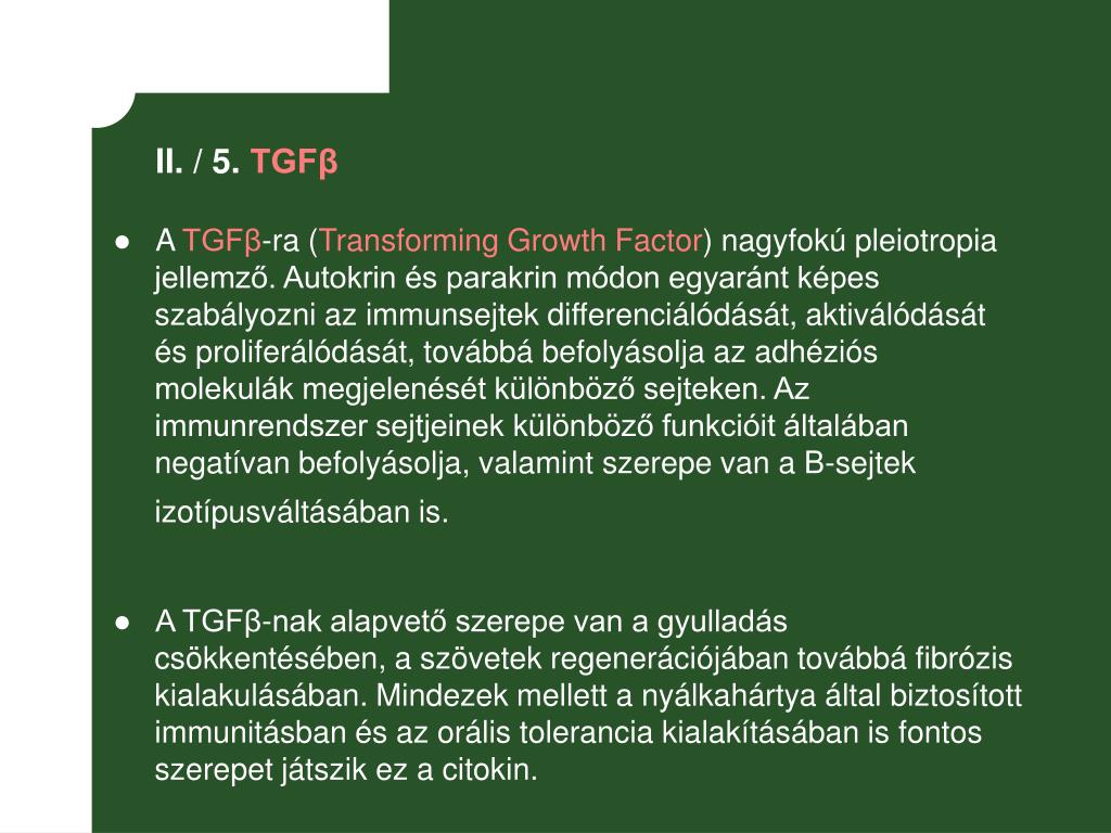 II. / 5. TGFβ ● A TGFβ-ra(Transforming Growth Factor) nagyfokú pleiotropia jellemző. Autokrin és parakrin módon egyaránt képes szabályozni az immunsejtek differenciálódását, aktiválódását és proliferálódását, továbbá befolyásolja az adhéziós molekulák megjelenését különböző sejteken. Az immunrendszer sejtjeinek különböző funkcióit általában negatívan befolyásolja, valamint szerepe van a B-sejtek izotípusváltásában is. ● A TGFβ-nak alapvető szerepe van a gyulladás csökkentésében, a szövetek regenerációjában továbbá fibrózis kialakulásában. Mindezek mellett a nyálkahártya által biztosított immunitásban és az orális tolerancia kialakításában is fontos szerepet játszik ez a citokin.