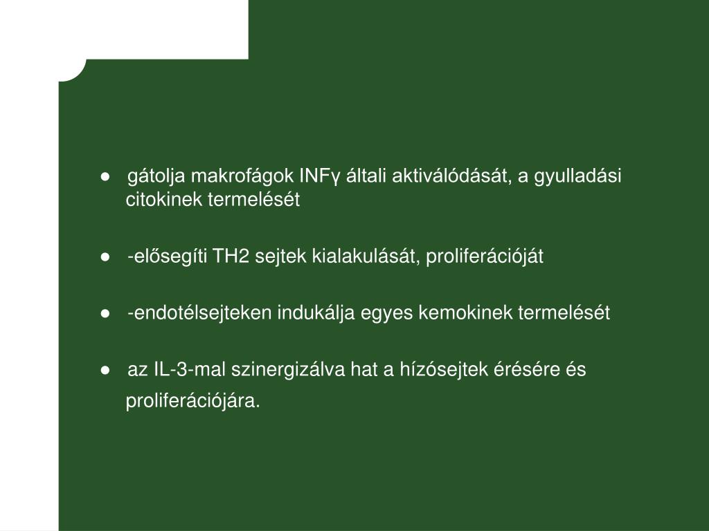 ● gátolja makrofágok INFγ általi aktiválódását, a gyulladási citokinek termelését ● -elősegíti TH2 sejtek kialakulását, proliferációját ● -endotélsejteken indukálja egyes kemokinek termelését ● az IL-3-mal szinergizálva hat a hízósejtek érésére és proliferációjára.