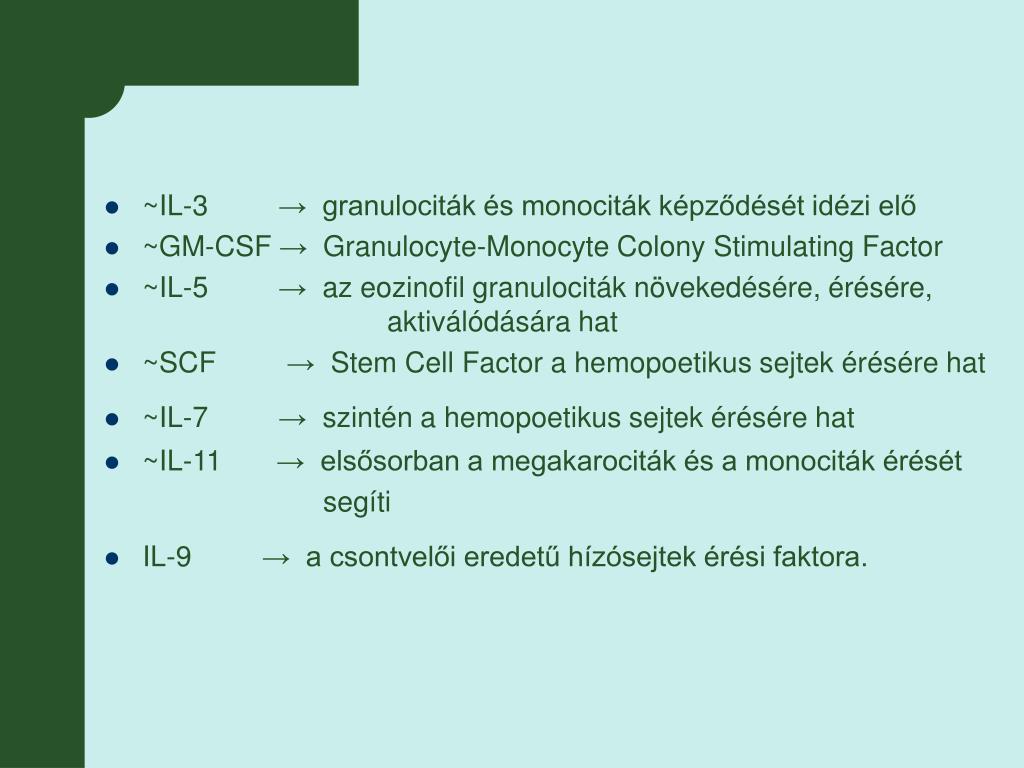 ~IL-3 → granulociták és monociták képződését idézi elő • ~GM-CSF → Granulocyte-Monocyte Colony Stimulating Factor • ~IL-5 → az eozinofil granulociták növekedésére, érésére, aktiválódására hat • ~SCF → Stem Cell Factor a hemopoetikus sejtek érésére hat • ~IL-7 → szintén a hemopoetikus sejtek érésére hat • ~IL-11 → elsősorban a megakarociták és a monociták érését segíti • IL-9 → a csontvelői eredetű hízósejtek érési faktora.