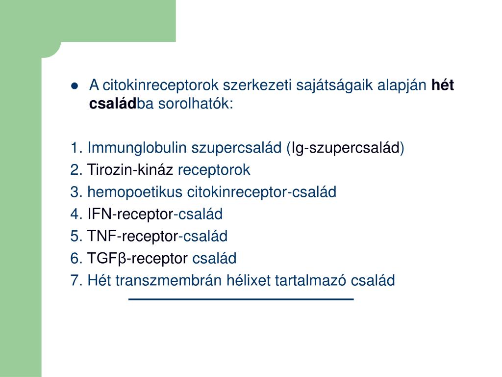 A citokinreceptorok szerkezeti sajátságaik alapján hétcsaládba sorolhatók: 1. Immunglobulin szupercsalád (Ig-szupercsalád) 2. Tirozin-kináz receptorok 3. hemopoetikus citokinreceptor-család 4. IFN-receptor-család 5. TNF-receptor-család 6. TGFβ-receptor család 7. Hét transzmembrán hélixet tartalmazó család
