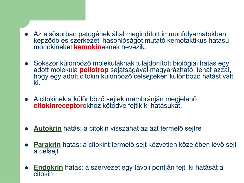 Az elsősorban patogének által megindított immunfolyamatokban képződő és szerkezeti hasonlóságot mutató kemotaktikus hatású monokineket kemokineknek nevezik. • Sokszor különböző molekuláknak tulajdonított biológiai hatás egy adott molekula peliotropsajátságával magyarázható, tehát azzal, hogy egy adott citokin különböző célsejteken különböző hatást vált ki. • A citokinek a különböző sejtek membránján megjelenő citokinreceptorokhoz kötődve fejtik ki hatásukat. • Autokrinhatás: a citokin visszahat az azt termelő sejtre • Parakrinhatás: a citokint termelő sejt közvetlen közelében lévő sejt a célsejt • Endokrinhatás: a szervezet egy távoli pontján fejti ki hatását a citokin