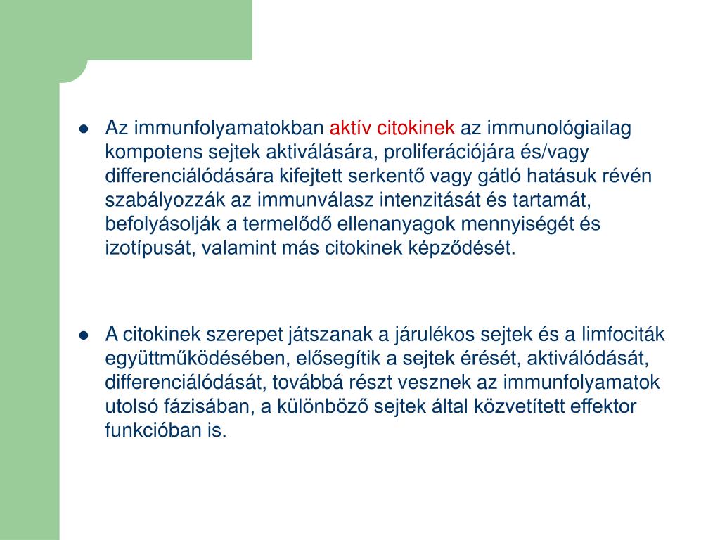 Az immunfolyamatokban aktív citokinek az immunológiailag kompotens sejtek aktiválására, proliferációjára és/vagy differenciálódására kifejtett serkentő vagy gátló hatásuk révén szabályozzák az immunválasz intenzitását és tartamát, befolyásolják a termelődő ellenanyagok mennyiségét és izotípusát, valamint más citokinek képződését. • A citokinek szerepet játszanak a járulékos sejtek és alimfociták együttműködésében, elősegítik a sejtek érését, aktiválódását, differenciálódását, továbbá részt vesznek az immunfolyamatok utolsó fázisában, a különböző sejtek által közvetített effektor funkcióban is.