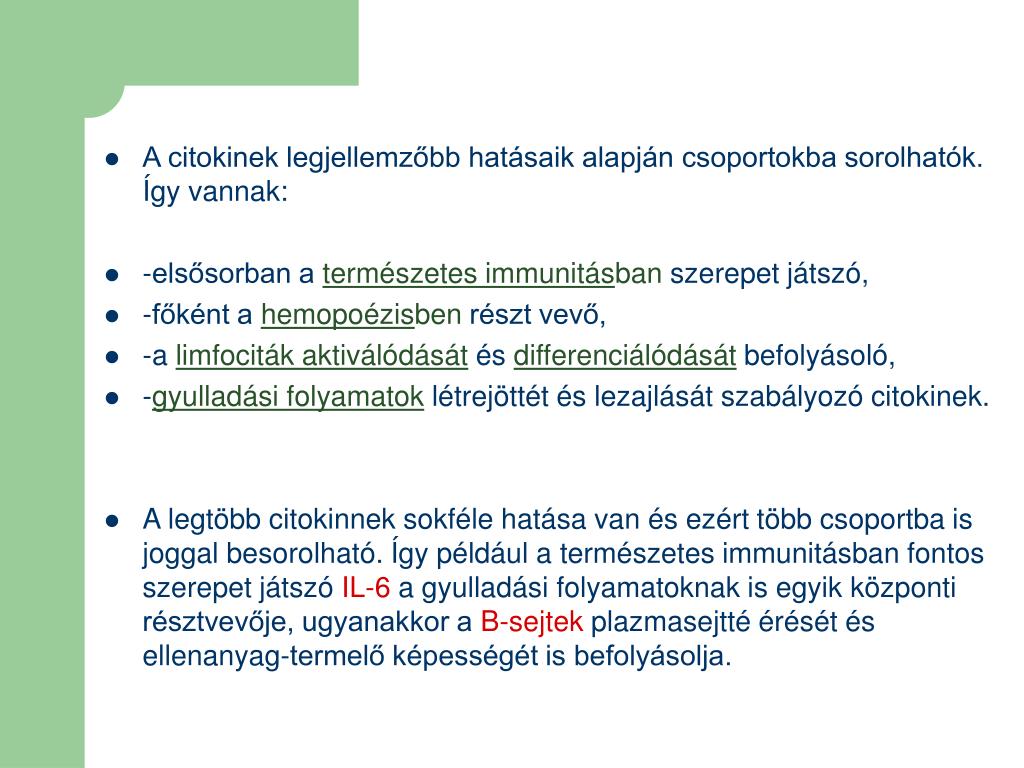 A citokinek általános jellemzése • A citokinek elsősorban intercelluláris kapcsolatokat közvetítő, kis molekulatömegű glikoproteidek, amelyek az immunválasz folyamán egyebek között az információtovábbításban és az immunválasz szabályozásában játszanak fontos szerepet. • Ezeket a humorális faktorokat nem csak az immunrendszer sejtjei termelik. Ugyanaz a faktor lehet limfocita és monocita eredetű is. Ezért közös nevet kaptak citokin elnevezéssel. • A szinonimaként használt interleukin(IL) elnevezés a leukociták közötti kapcsolat létesítésére utal.