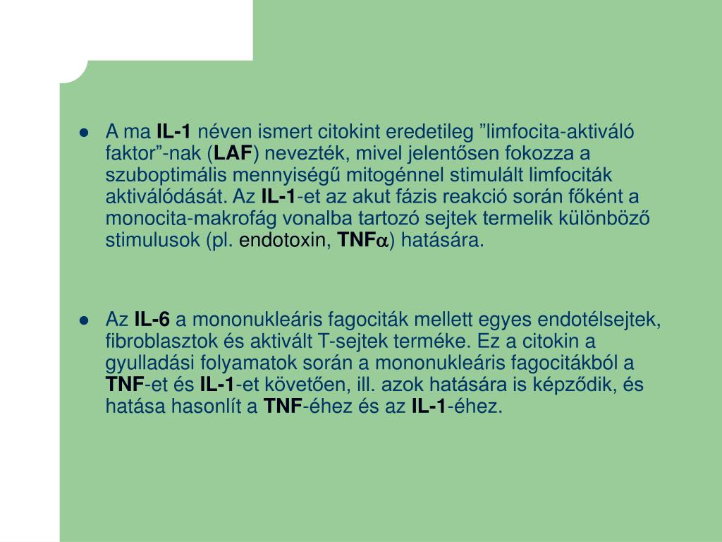 A ma IL-1 néven ismert citokint eredetileg ”limfocita-aktiváló faktor”-nak (LAF) nevezték, mivel jelentősen fokozza a szuboptimális mennyiségű mitogénnel stimulált limfociták aktiválódását. Az IL-1-et az akut fázis reakció során főként a monocita-makrofág vonalba tartozó sejtek termelik különböző stimulusok (pl. endotoxin, TNF) hatására. • Az IL-6 a mononukleáris fagociták mellett egyes endotélsejtek, fibroblasztok és aktivált T-sejtek terméke. Ez a citokin a gyulladási folyamatok során a mononukleáris fagocitákból a TNF-et és IL-1-et követően, ill. azok hatására is képződik, és hatása hasonlít a TNF-éhez és az IL-1-éhez.