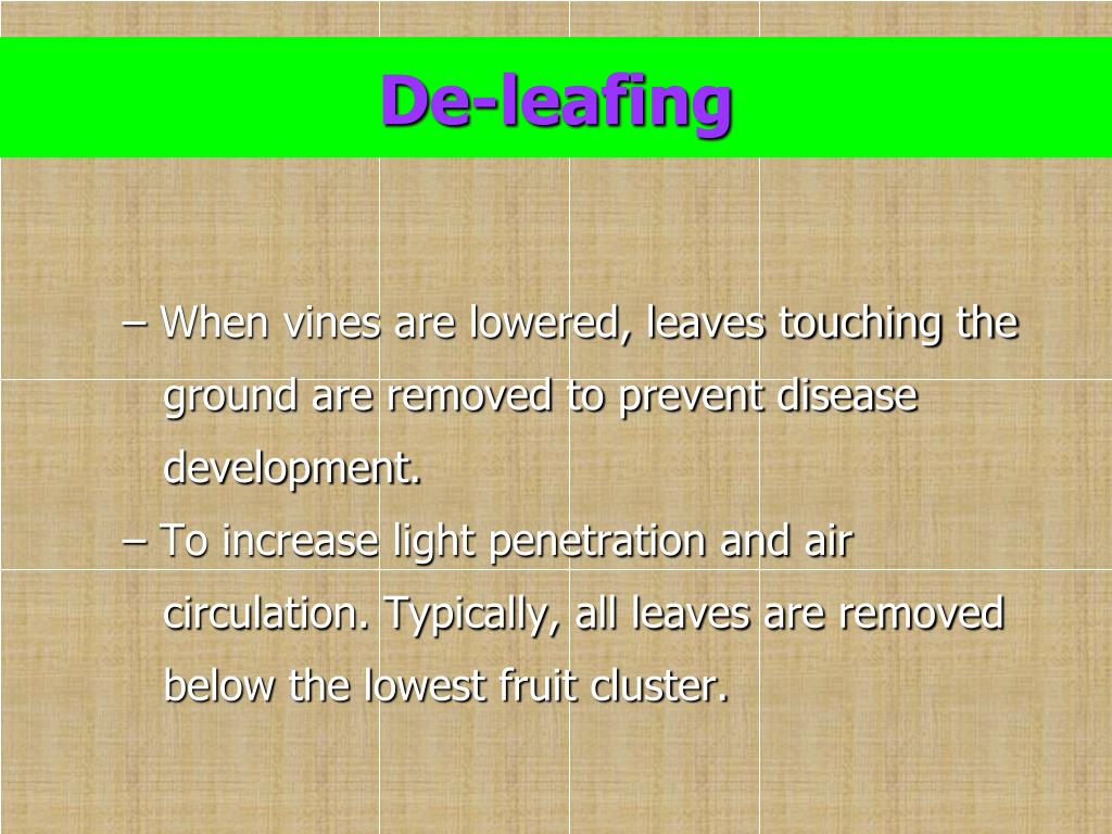 De-leafing • When vines are lowered, leaves touching the ground are removed to prevent disease development. • To increase light penetration and air circulation. Typically, all leaves are removed below the lowest fruit cluster.