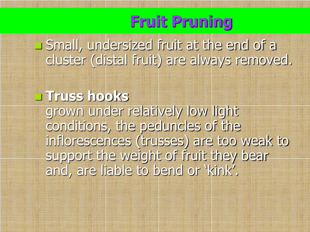Fruit Pruning • Small, undersized fruit at the end of a cluster (distal fruit) are always removed. • Truss hooksgrown under relatively low light conditions, the peduncles of the inflorescences (trusses) are too weak to support the weight of fruit they bear and, are liable to bend or ‘kink’.