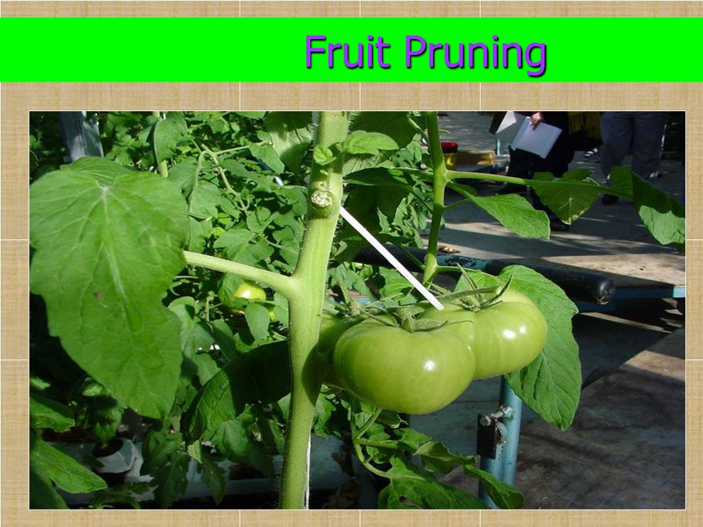 Topping • Six weeks before the anticipated crop termination date, the growing point and small fruit clusters at the top of the plant are removed. • fruit requires 7-8 weeks from anthesis to harvest so small fruit will not have enough time to develop to maturity. • Increase size of already-set fruit in the lower part of the plant.