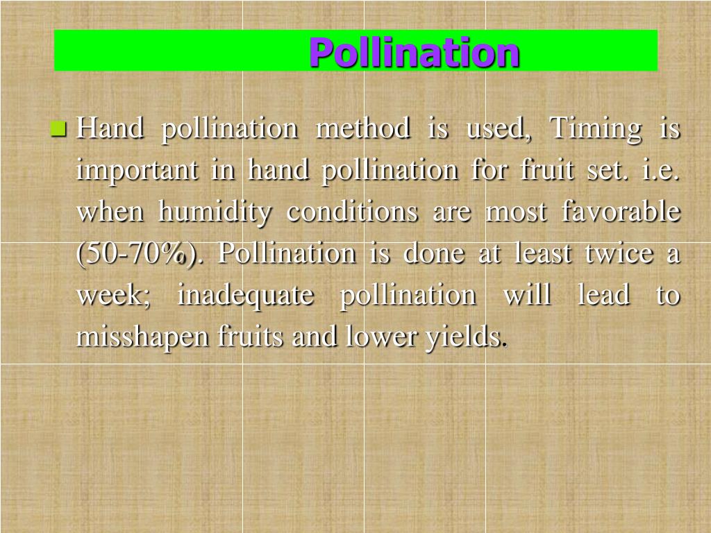 Pollination • Hand pollination method is used, Timing is important in hand pollination for fruit set. i.e. when humidity conditions are most favorable (50-70%). Pollination is done at least twice a week; inadequate pollination will lead to misshapen fruits and lower yields.
