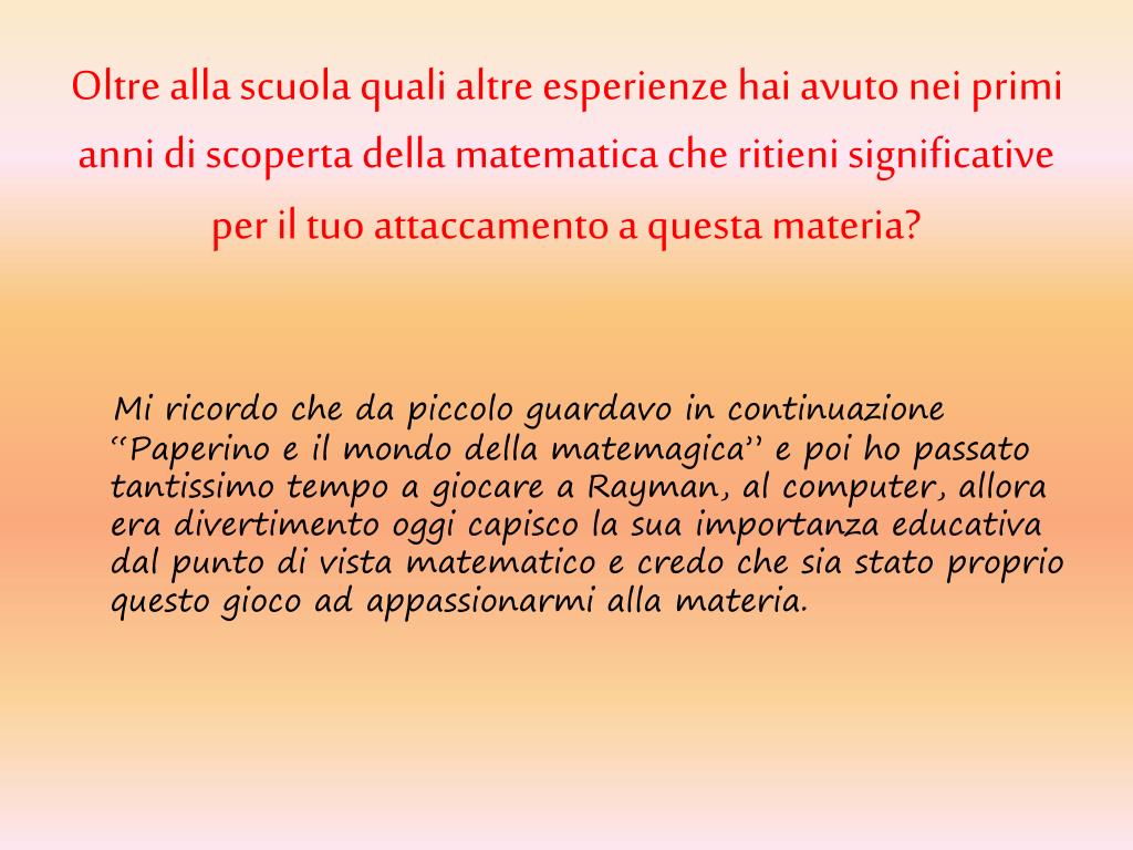 Perchè secondo te la matematica è una materia importante? La matematica ci permette di capire meglio la realtà che ci circonda, ci aiuta ad avere una mente più aperta, ci invita al ragionamento dandoci grande soddisfazioni. La matematica, mi ha aiutato molto, ha formato la mia personalità perché mi ha insegnato a non arrendermi mai, devo soprattutto alla matematica la mia determinazione.