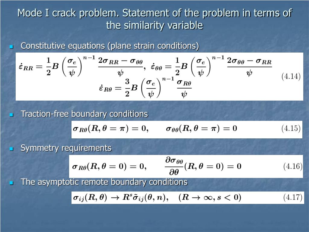 Mode I crack problem. Statement of the problem in terms of the similarity variable • Constitutive equations (plane strain conditions) • Traction-free boundary conditions • Symmetry requirements • The asymptotic remote boundary conditions