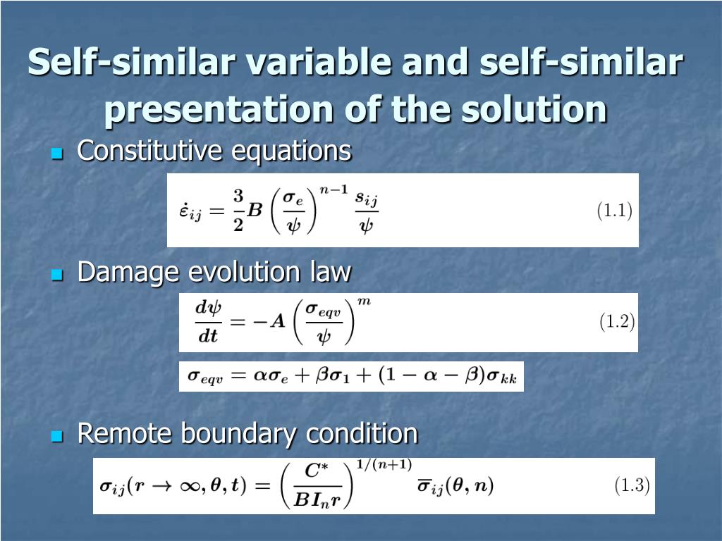 Self-similar variable and self-similar presentation of the solution • Constitutive equations • Damage evolution law • Remote boundary condition