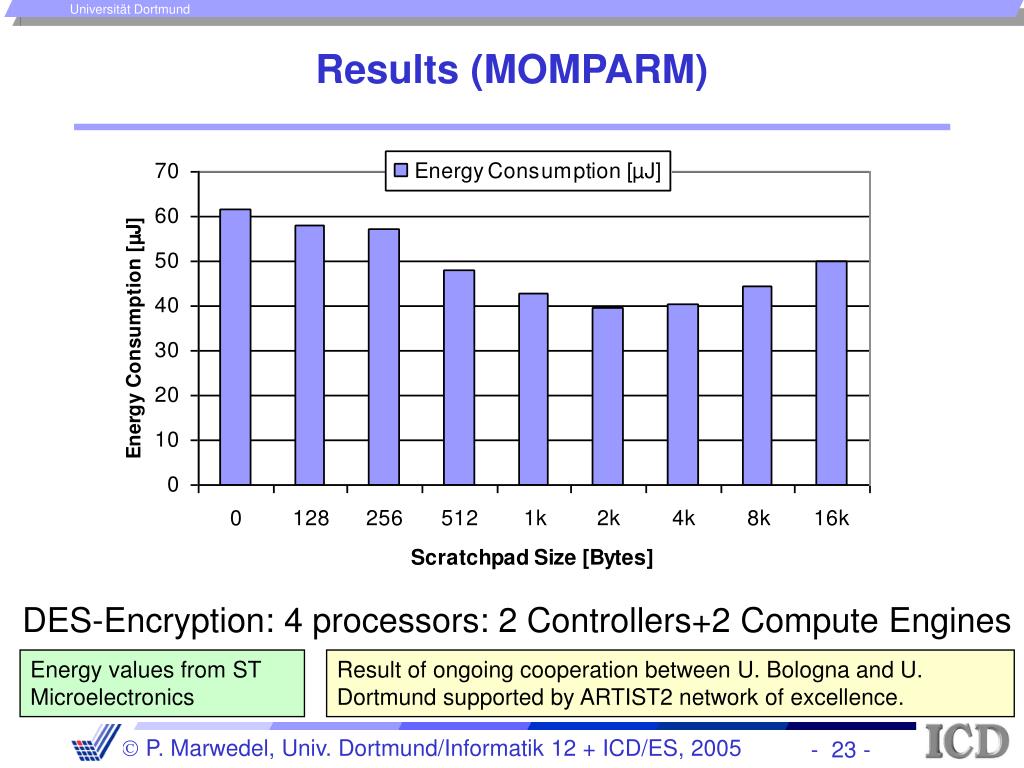Results (MOMPARM) DES-Encryption: 4 processors: 2 Controllers+2 Compute Engines Energy values from ST Microelectronics Result of ongoing cooperation between U. Bologna and U. Dortmund supported by ARTIST2 network of excellence.