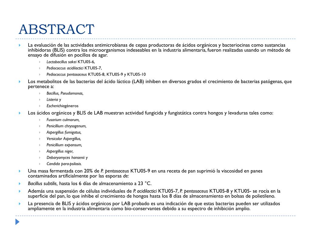 abstract • La evaluación de las actividades antimicrobianas de cepas productoras de ácidos orgánicos y bacteriocinas como sustancias inhibidoras (BLIS) contra los microorganismos indeseables en la industria alimentaria, fueron realizadas usando un método de ensayo de difusión en pocillos de agar. • Lactobacillussakei KTU05-6, • Pediococcusacidilactici KTU05-7, • Pediococcuspentosaceus KTU05-8, KTU05-9 y KTU05-10 • Los metabolitos de las bacterias del ácido láctico (LAB) inhiben en diversos grados el crecimiento de bacterias patógenas, que pertenece a: • Bacillus, Pseudomonas, • Listeria y • Escherichiagéneros • Los ácidos orgánicos y BLIS de LAB muestran actividad fungicida y fungistática contra hongos y levaduras tales como: • Fusarium culmorum, • Penicilliumchrysogenum, • Aspergillus fumigatus, • Versicolor Aspergillus, • Penicilliumexpansum, • Aspergillus niger, • Debaryomyceshansenii y • Candida para-psilosis. • Una masa fermentada con 20% de P.pentosaceus KTU05-9 en una receta de pan suprimió la viscosidad en panes contaminados artificialmente por las esporas de: • Bacillussubtilis, hasta los 6 días de almacenamiento a 23 °C. • Además una suspensión de células individuales de P. acidilactici KTU05-7, P.pentosaceus KTU05-8 y KTU05- se rocía en la superficie del pan, lo que inhibe el crecimiento de hongos hasta los 8 días de almacenamiento en bolsas de polietileno. • La presencia de BLIS y ácidos orgánicos por LAB probado es una indicación de que estas bacterias pueden ser utilizados ampliamente en la industria alimentaria como bio-conservantes debido a su espectro de inhibición amplio.