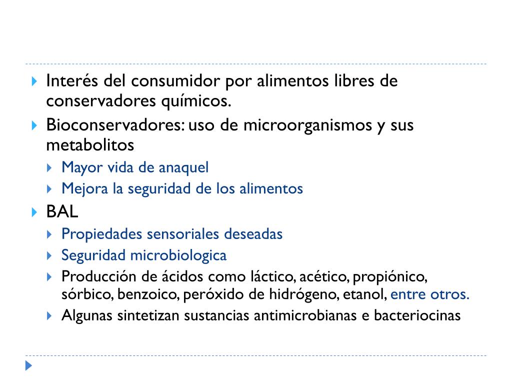 Interés del consumidor por alimentos libres de conservadores químicos. • Bioconservadores: uso de microorganismos y sus metabolitos • Mayor vida de anaquel • Mejora la seguridad de los alimentos • BAL • Propiedades sensoriales deseadas • Seguridad microbiologica • Producción de ácidos como láctico, acético, propiónico, sórbico, benzoico, peróxido de hidrógeno, etanol, entre otros. • Algunas sintetizan sustancias antimicrobianas e bacteriocinas