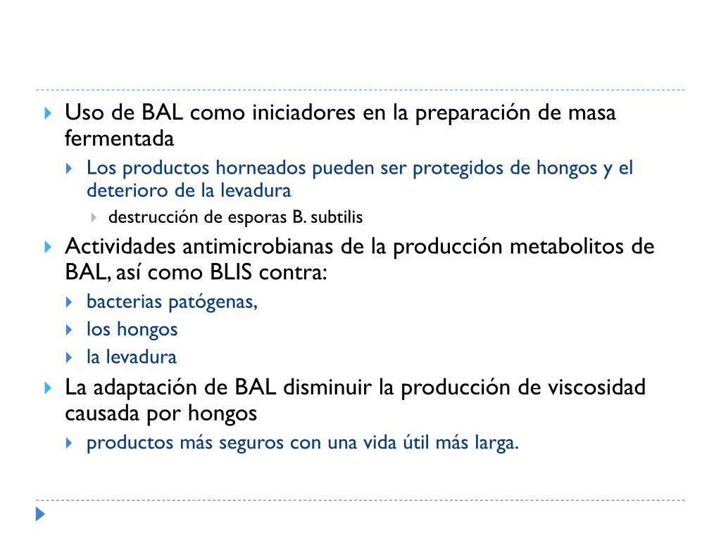 Uso de BAL como iniciadores en la preparación de masa fermentada • Los productos horneados pueden ser protegidos de hongos y el deterioro de la levadura • destrucción de esporas B. subtilis • Actividades antimicrobianas de la producción metabolitos de BAL, así como BLIS contra: • bacterias patógenas, • los hongos • la levadura • La adaptación de BAL disminuir la producción de viscosidad causada por hongos • productos más seguros con una vida útil más larga.