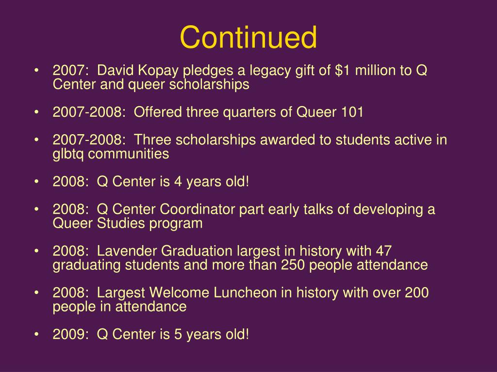 Continued • 2007: David Kopay pledges a legacy gift of $1 million to Q Center and queer scholarships • 2007-2008: Offered three quarters of Queer 101 • 2007-2008: Three scholarships awarded to students active in glbtq communities • 2008: Q Center is 4 years old! • 2008: Q Center Coordinator part early talks of developing a Queer Studies program • 2008: Lavender Graduation largest in history with 47 graduating students and more than 250 people attendance • 2008: Largest Welcome Luncheon in history with over 200 people in attendance • 2009: Q Center is 5 years old!