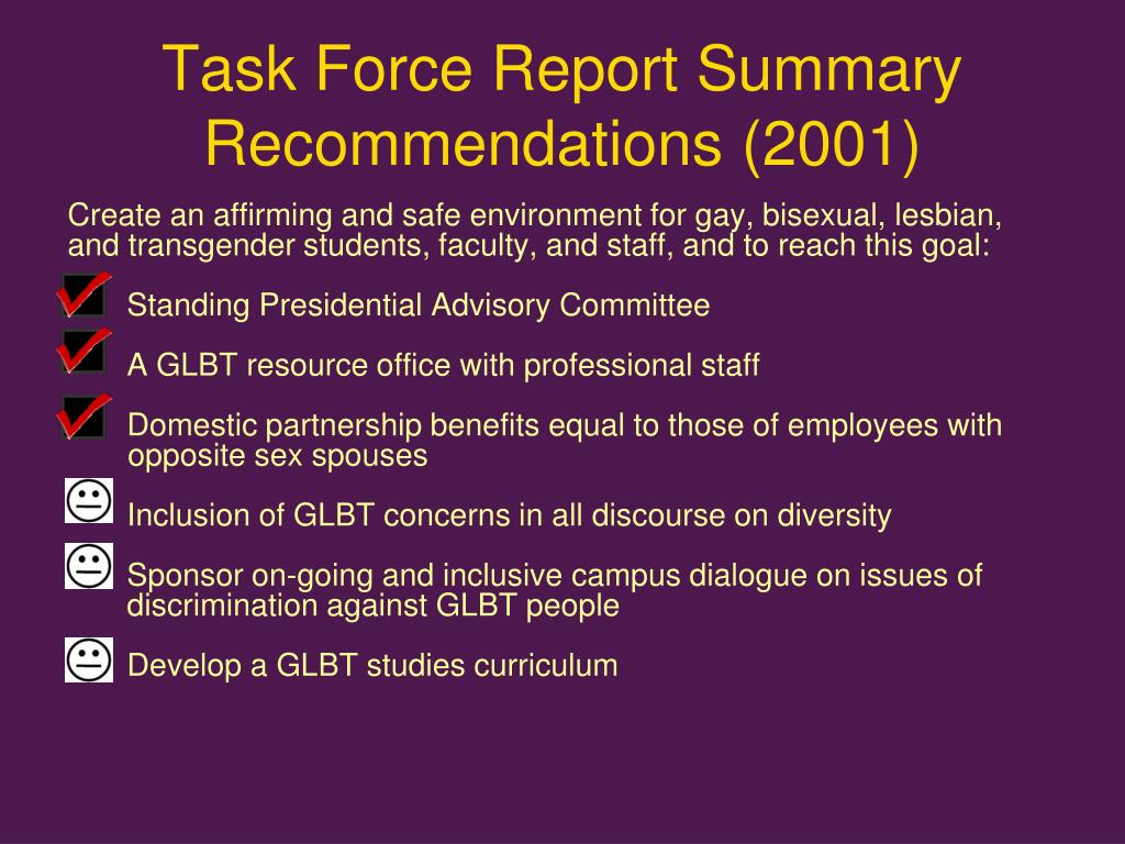 Task Force Report Summary Recommendations (2001) Create an affirming and safe environment for gay, bisexual, lesbian, and transgender students, faculty, and staff, and to reach this goal: • Standing Presidential Advisory Committee • A GLBT resource office with professional staff • Domestic partnership benefits equal to those of employees with opposite sex spouses • Inclusion of GLBT concerns in all discourse on diversity • Sponsor on-going and inclusive campus dialogue on issues of discrimination against GLBT people • Develop a GLBT studies curriculum