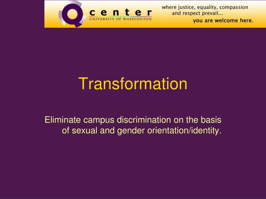 Transformation Eliminate campus discrimination on the basis of sexual and gender orientation/identity.