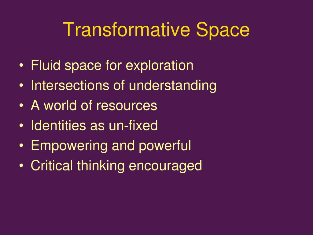 Transformative Space • Fluid space for exploration • Intersections of understanding • A world of resources • Identities as un-fixed • Empowering and powerful • Critical thinking encouraged