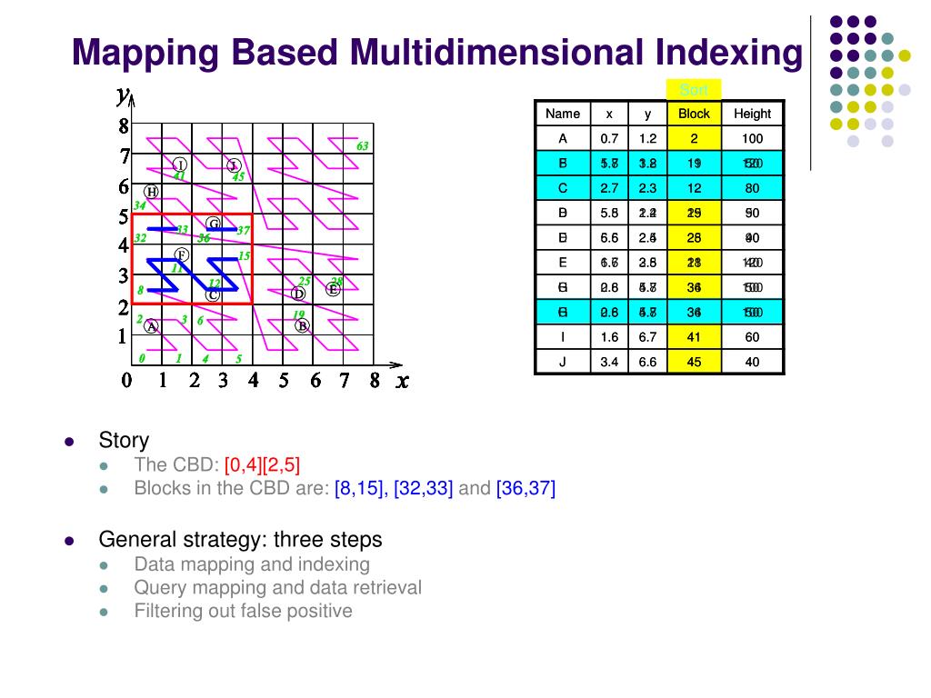 Mapping Based Multidimensional Indexing Sort • Story • The CBD:[0,4][2,5] • Blocks in the CBD are:[8,15], [32,33]and[36,37] • General strategy: three steps • Data mapping and indexing • Query mapping and data retrieval • Filtering out false positive