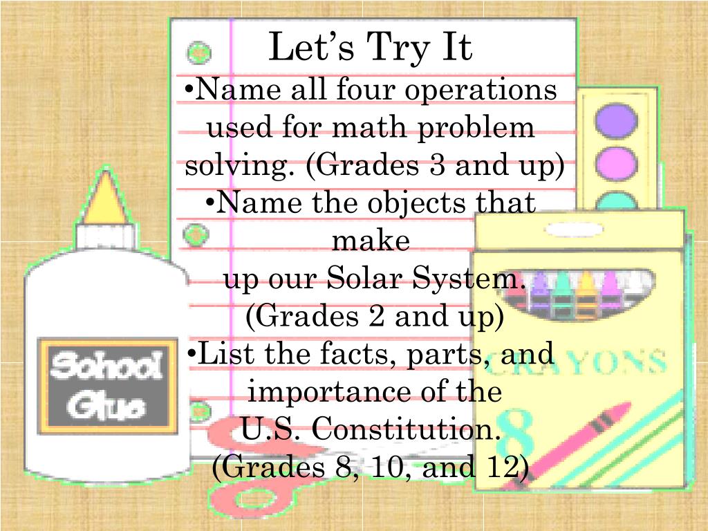 Let’s Try It • Name all four operations • used for math problem • solving. (Grades 3 and up) • Name the objects that make • up our Solar System. • (Grades 2 and up) • List the facts, parts, and • importance of the • U.S. Constitution. • (Grades 8, 10, and 12)