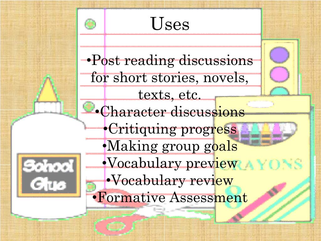 Uses • Post reading discussions for short stories, novels, texts, etc. • Character discussions • Critiquing progress • Making group goals • Vocabulary preview • Vocabulary review • Formative Assessment