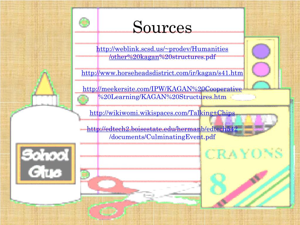 Sources http://weblink.scsd.us/~prodev/Humanities /other%20kagan%20structures.pdf http://www.horseheadsdistrict.com/ir/kagan/s41.htm http://meekersite.com/IPW/KAGAN%20Cooperative %20Learning/KAGAN%20Structures.htm http://wikiwomi.wikispaces.com/Talking+Chips http://edtech2.boisestate.edu/hermanb/edtech542 /documents/CulminatingEvent.pdf