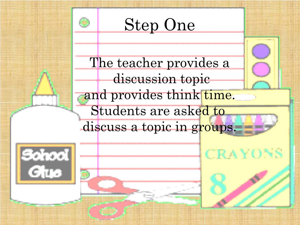 Step One The teacher provides a discussion topic and provides think time. Students are asked to discuss a topic in groups.