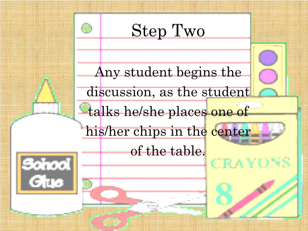 Step Two Any student begins the discussion, as the student talks he/she places one of his/her chips in the center of the table.