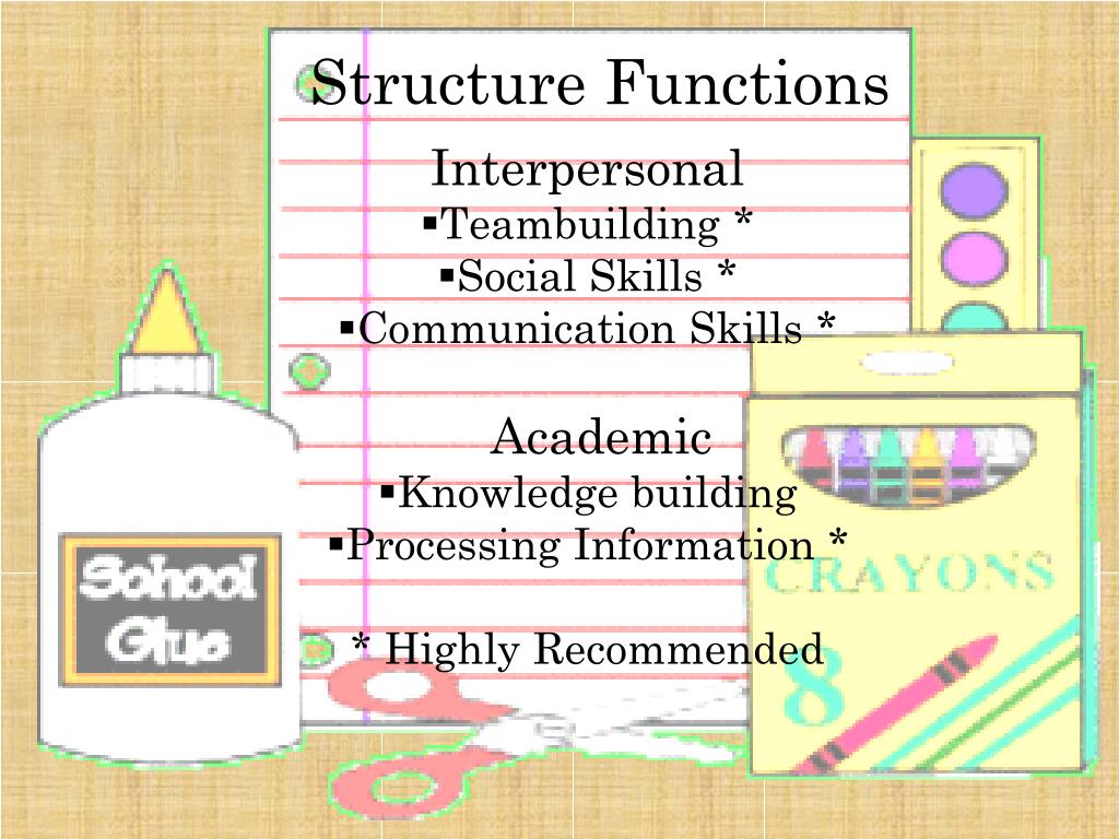 Structure Functions • Interpersonal • Teambuilding * • Social Skills * • Communication Skills * • Academic • Knowledge building • Processing Information * • * Highly Recommended