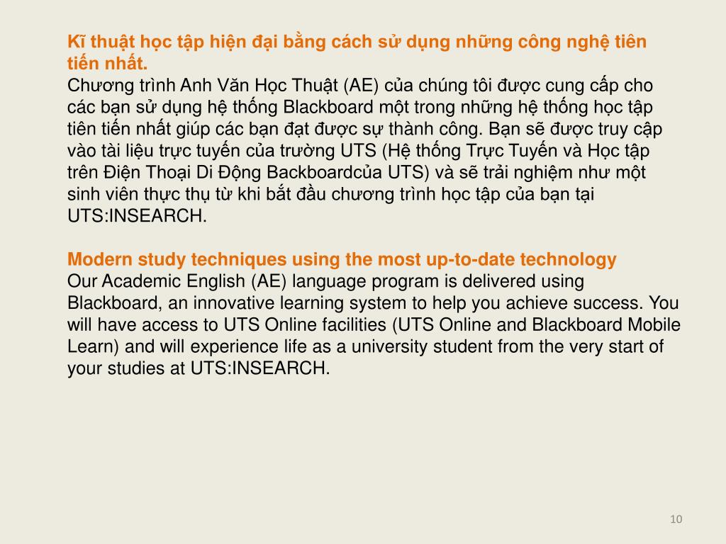 Kĩthuậthọctậphiệnđạibằngcáchsửdụngnhữngcôngnghệtiêntiếnnhất.Kĩthuậthọctậphiệnđạibằngcáchsửdụngnhữngcôngnghệtiêntiếnnhất. Chươngtrình Anh VănHọcThuật (AE) củachúngtôiđượccungcấpchocácbạnsửdụnghệthống Blackboard mộttrongnhữnghệthốnghọctậptiêntiếnnhấtgiúpcácbạnđạtđượcsựthànhcông. Bạnsẽđượctruycậpvàotàiliệutrựctuyếncủatrường UTS (HệthốngTrựcTuyếnvàHọctậptrênĐiệnThoại Di ĐộngBackboardcủa UTS) vàsẽtrảinghiệmnhưmộtsinhviênthựcthụtừkhibắtđầuchươngtrìnhhọctậpcủabạntại UTS:INSEARCH. Modern study techniques using the most up-to-date technology Our Academic English (AE) language program is delivered using Blackboard, an innovative learning system to help you achieve success. You will have access to UTS Online facilities (UTS Online and Blackboard Mobile Learn) and will experience life as a university student from the very start of your studies at UTS:INSEARCH.