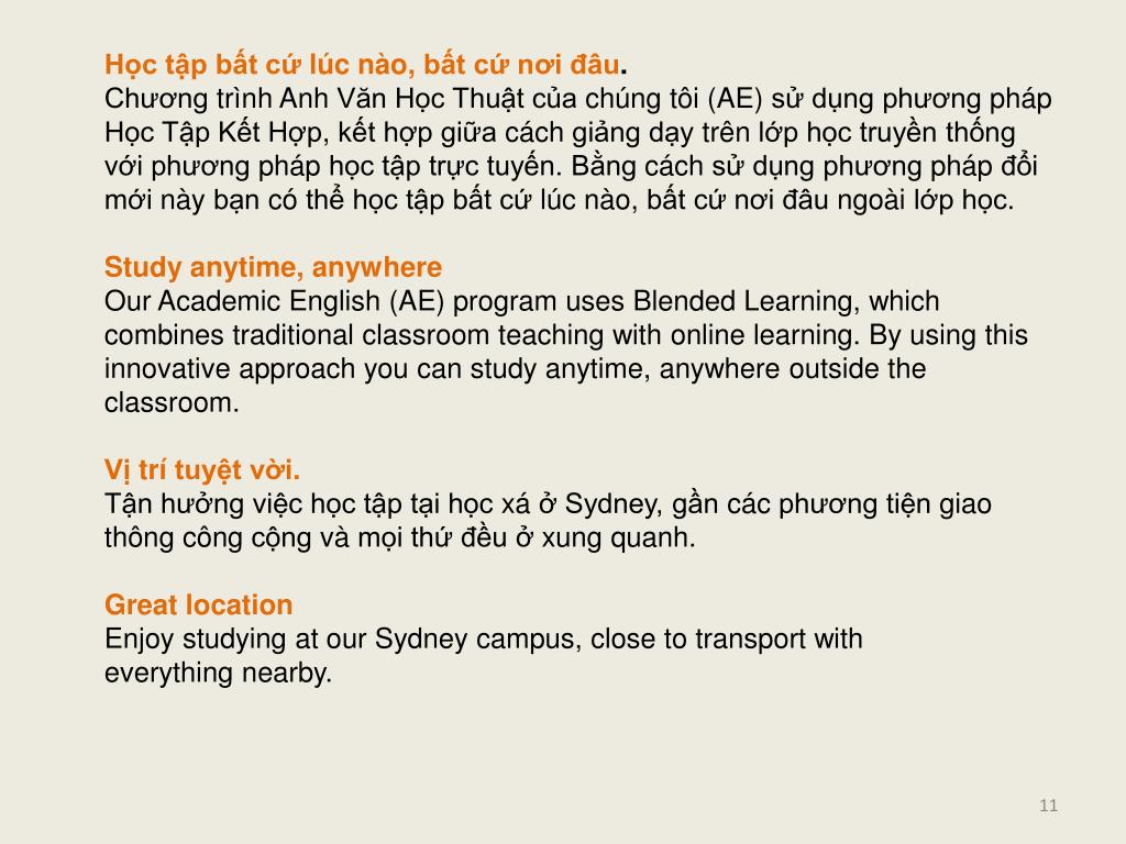 Họctậpbấtcứlúcnào, bấtcứnơiđâu. Chươngtrình Anh VănHọcThuậtcủachúngtôi (AE) sửdụngphươngphápHọcTậpKếtHợp, kếthợpgiữacáchgiảngdạytrênlớphọctruyềnthốngvớiphươngpháphọctậptrựctuyến. Bằngcáchsửdụngphươngphápđổimớinàybạncóthểhọctậpbấtcứlúcnào, bấtcứnơiđâungoàilớphọc. Study anytime, anywhere Our Academic English (AE) program uses Blended Learning, which combines traditional classroom teaching with online learning. By using this innovative approach you can study anytime, anywhere outside the classroom. Vịtrítuyệtvời. Tậnhưởngviệchọctậptạihọcxá ở Sydney, gầncácphươngtiệngiaothôngcôngcộngvàmọithứđều ở xungquanh. Great location Enjoy studying at our Sydney campus, close to transport with everything nearby.