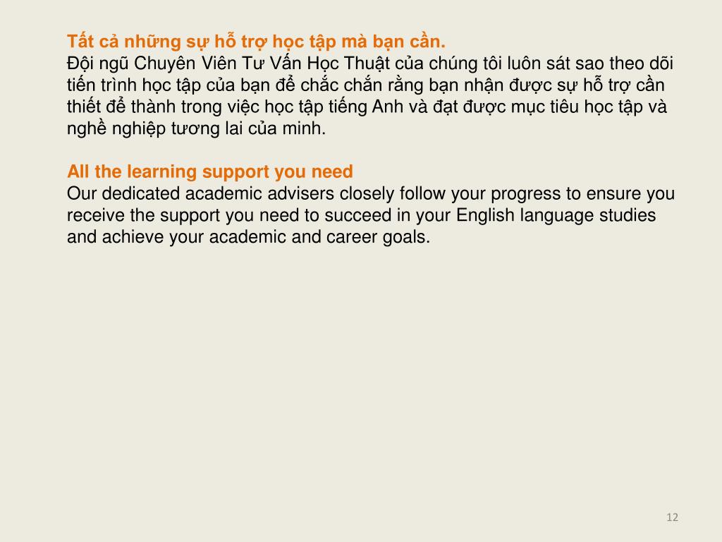 Tấtcảnhữngsựhỗtrợhọctậpmàbạncần. ĐộingũChuyênViênTưVấnHọcThuậtcủachúngtôiluônsátsaotheodõitiếntrìnhhọctậpcủabạnđểchắcchắnrằngbạnnhậnđượcsựhỗtrợcầnthiếtđểthànhtrongviệchọctậptiếng Anh vàđạtđượcmụctiêuhọctậpvànghềnghiệptươnglaicủa minh. All the learning support you need Our dedicated academic advisers closely follow your progress to ensure you receive the support you need to succeed in your English language studies and achieve your academic and career goals.