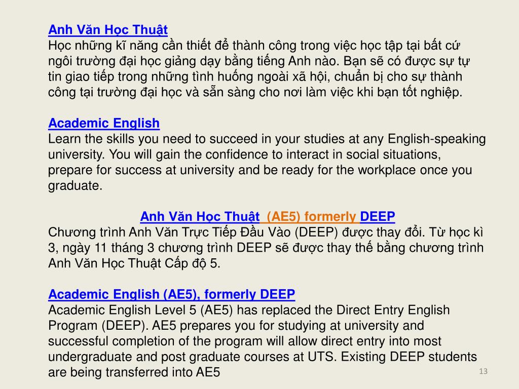 Anh VănHọcThuật Họcnhữngkĩnăngcầnthiếtđểthànhcôngtrongviệchọctậptạibấtcứngôitrườngđạihọcgiảngdạybằngtiếng Anh nào. Bạnsẽcóđượcsựtự tin giaotiếptrongnhữngtìnhhuốngngoàixãhội, chuẩnbịchosựthànhcôngtạitrườngđạihọcvàsẵnsàngchonơilàmviệckhibạntốtnghiệp. Academic English Learn the skills you need to succeed in your studies at any English-speaking university. You will gain the confidence to interact in social situations, prepare for success at university and be ready for the workplace once you graduate. Anh VănHọcThuật (AE5) formerly DEEP Chươngtrình Anh VănTrựcTiếpĐầuVào (DEEP) đượcthayđổi. Từhọckì 3, ngày 11 tháng 3 chươngtrình DEEP sẽđượcthaythếbằngchươngtrình Anh VănHọcThuậtCấpđộ 5. Academic English (AE5), formerly DEEP Academic English Level 5 (AE5) has replaced the Direct Entry English Program (DEEP). AE5 prepares you for studying at university and successful completion of the program will allow direct entry into most undergraduate and post graduate courses at UTS. Existing DEEP students are being transferred into AE5