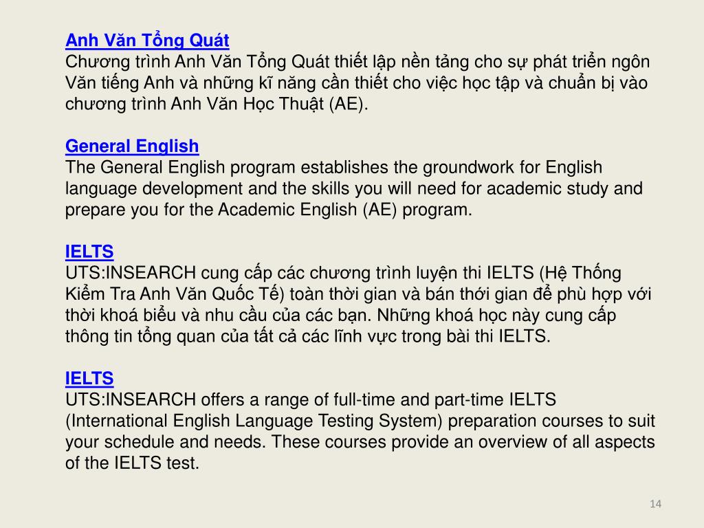 Anh VănTổngQuát Chươngtrình Anh VănTổngQuátthiếtlậpnềntảngchosựpháttriểnngônVăntiếng Anh vànhữngkĩnăngcầnthiếtchoviệchọctậpvàchuẩnbịvàochươngtrình Anh VănHọcThuật (AE). General English The General English program establishes the groundwork for English language development and the skills you will need for academic study and prepare you for the Academic English (AE) program. IELTS UTS:INSEARCH cungcấpcácchươngtrìnhluyệnthi IELTS (HệThốngKiểmTra Anh VănQuốcTế) toànthờigianvàbánthớigianđểphùhợpvớithờikhoábiểuvànhucầucủacácbạn. Nhữngkhoáhọcnàycungcấpthông tin tổngquancủatấtcảcáclĩnhvựctrongbàithi IELTS. IELTS UTS:INSEARCH offers a range of full-time and part-time IELTS (International English Language Testing System) preparation courses to suit your schedule and needs. These courses provide an overview of all aspects of the IELTS test.