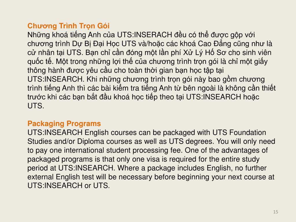 ChươngTrìnhTrọnGói Nhữngkhoátiếng Anh của UTS:INSERACH đềucóthểđượcgộpvớichươngtrìnhDựBịĐạiHọc UTS và/hoặccáckhoá Cao Đẳngcũngnhưlàcửnhântại UTS. BạnchỉcầnđóngmộtlầnphíXửLýHốSơchosinhviênquốctế. Mộttrongnhữnglợithếcủachươngtrìnhtrọngóilàchỉmộtgiấythônghànhđượcyêucầuchotoànthờigianbạnhọctậptại UTS:INSEARCH. Khinhữngchươngtrìnhtrọngóinàybaogồmchươngtrìnhtiếng Anh thìcácbàikiểmtratiếng Anh từbênngoàilàkhôngcầnthiếttrướckhicácbạnbắtđầukhoáhọctiếptheotại UTS:INSEARCH hoặc UTS. Packaging Programs UTS:INSEARCH English courses can be packaged with UTS Foundation Studies and/or Diploma courses as well as UTS degrees. You will only need to pay one international student processing fee. One of the advantages of packaged programs is that only one visa is required for the entire study period at UTS:INSEARCH. Where a package includes English, no further external English test will be necessary before beginning your next course at UTS:INSEARCH or UTS.